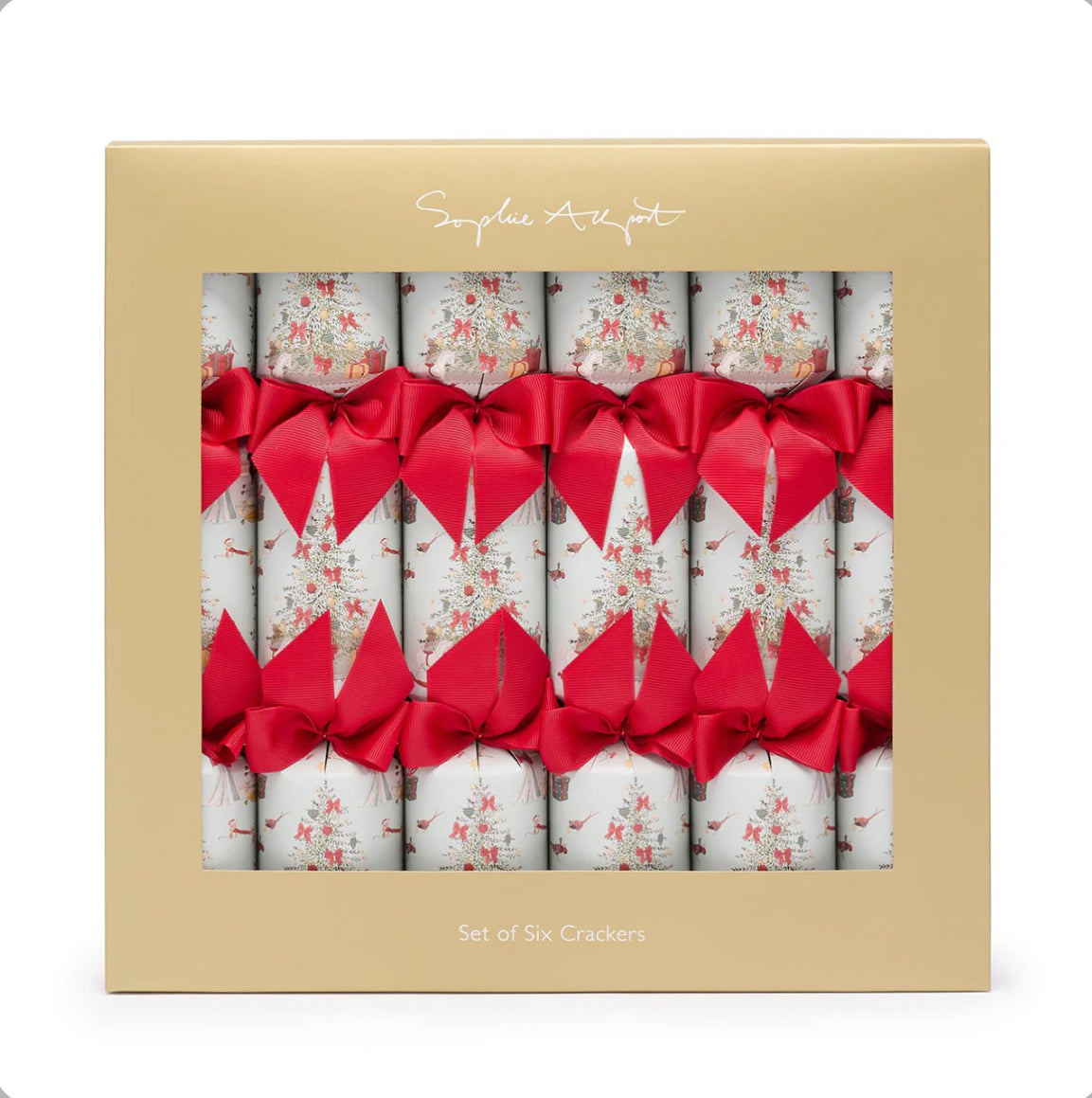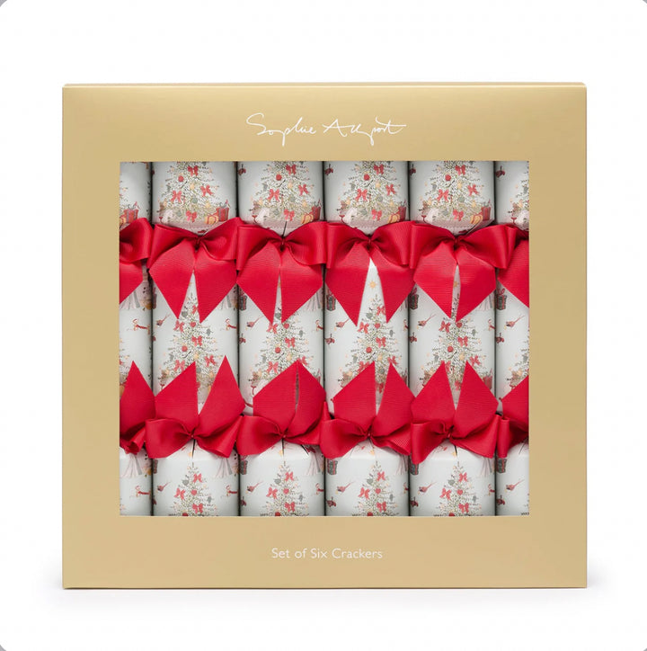 Ge ditt julbord en touch av festlig magi med dessa vackert designade crackers. Med Sophies handritade Cosy Christmas-illustration fångar varje cracker en nostalgisk scen av ett glittrande träd och skogsdjur som samlats för att fira. Färdiga med rika röda band för en elegant touch, ger dessa traditionella crackers klassisk brittisk charm och glädje till dina festliga sammankomster.