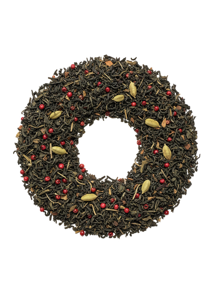 Grönt te med nejlika, kanel, kardemumma, rosépeppar, romarom, naturlig apelsinsarom .