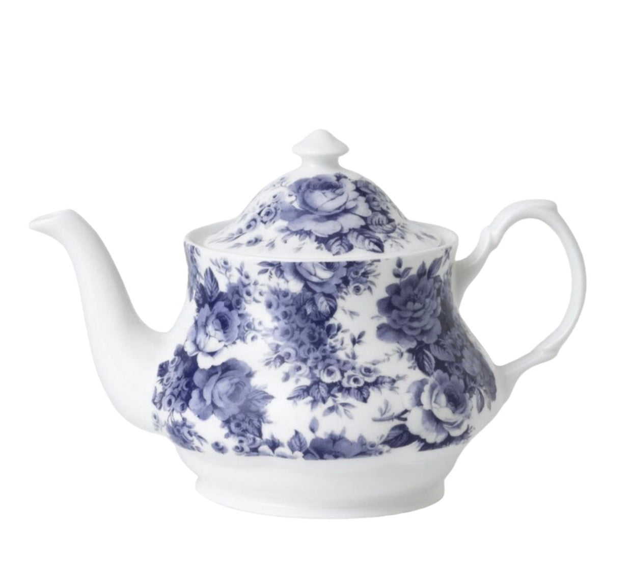 En elegant tekanna i engelsk benporslin dekorerad i vackra blå rosor. Inspirerad av de övervägande Staffordshire-tillverkade engelska Blue Chintz-mönstren som blomstrade mellan 1920- och 1960-talen. Roy Kirkham Blue Chintz-kollektionen är en modern version av det traditionella mönstret.