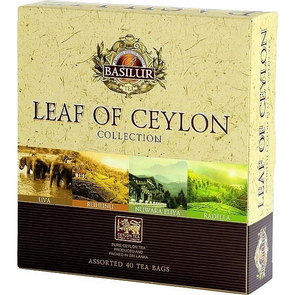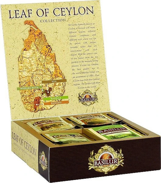 Presentförpackningen Leaf of Ceylon erbjuder en smakprovning av teer från Sri Lankas mest berömda teregioner - Uva, Nuwara Eliya, Ruhunu och Radella.