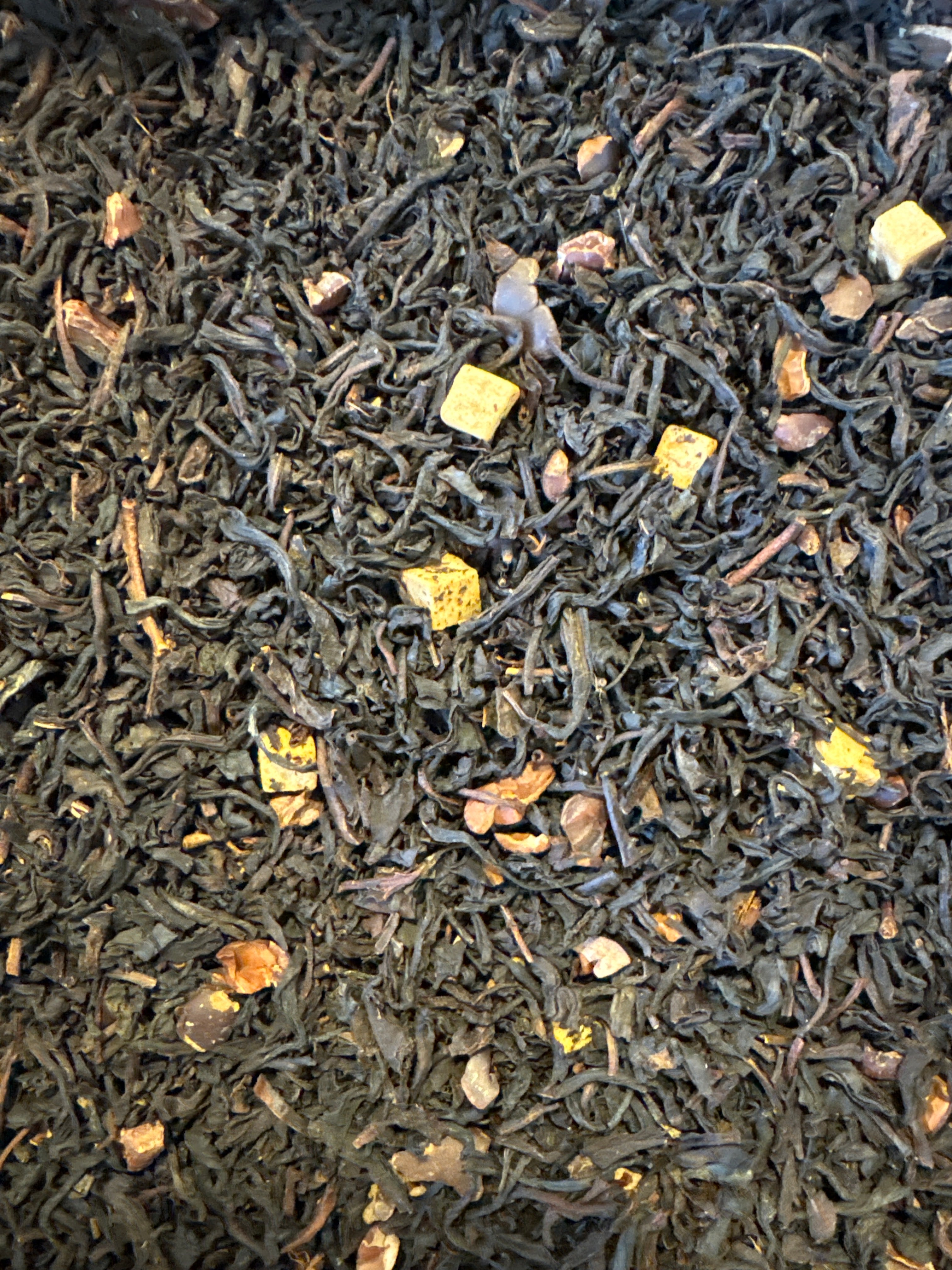 svart te smaksatt med kakaobitar, smörkaramellbitar och naturligt baserat arom.