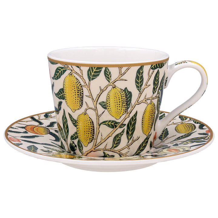 En utsökt kopp med tillhörande fat i porslin, dekorerad med William Morris ikoniska Fruits-mönster. En hyllning till hantverk, tradition och skönhet – perfekt för afternoon tea, en god Earl Grey eller varför inte en festlig hallonte?